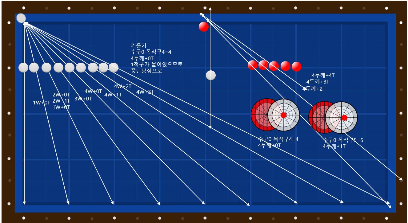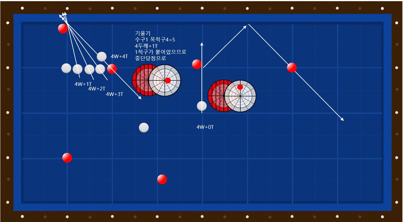 1/2 두께, 중앙당점, 가볍게 툭 short( 세운다, 1공거리), 좌로 90도 진행반사
