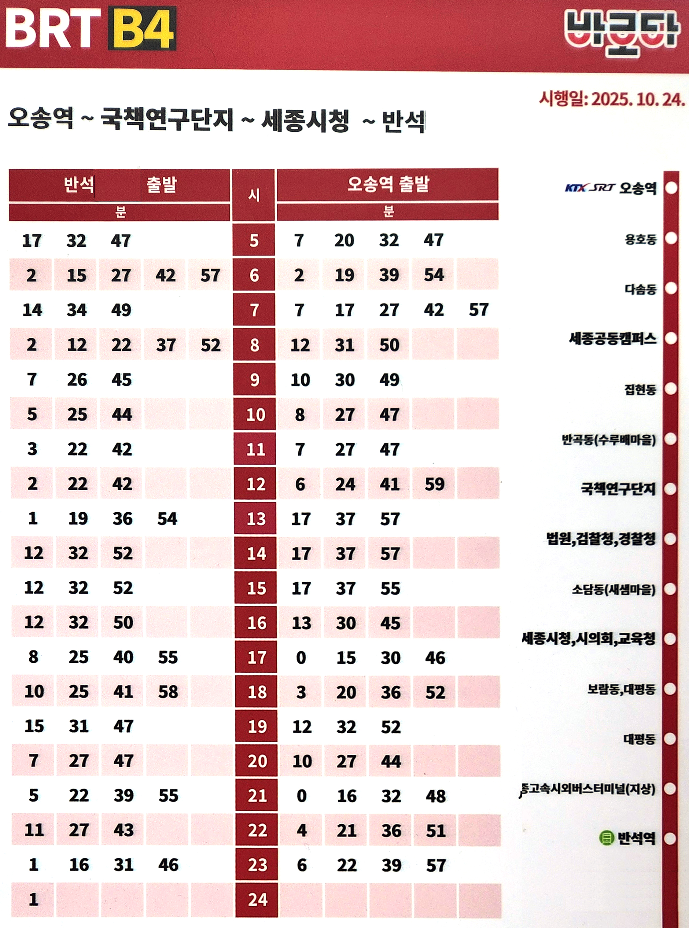 - 반석역 출발: 세종터미널 출발 4:55분 첫차/5시 반석역 첫차~24시 32분 막차