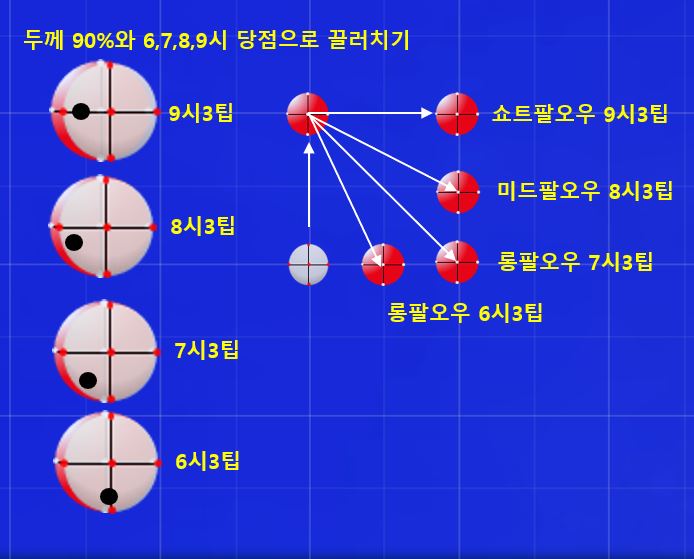 - 두께90% 6,7,8,9시 3팁으로 끌어치기