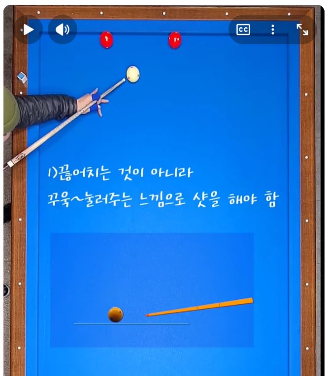 - 스트로크: 거리가 가깝든 멀든 큐끝을 짧게하고 "툭" 가볍게친다. 끌어치는 느낌을 최소화한다.