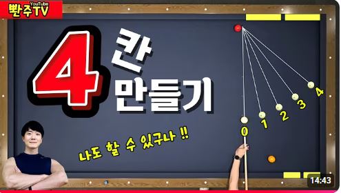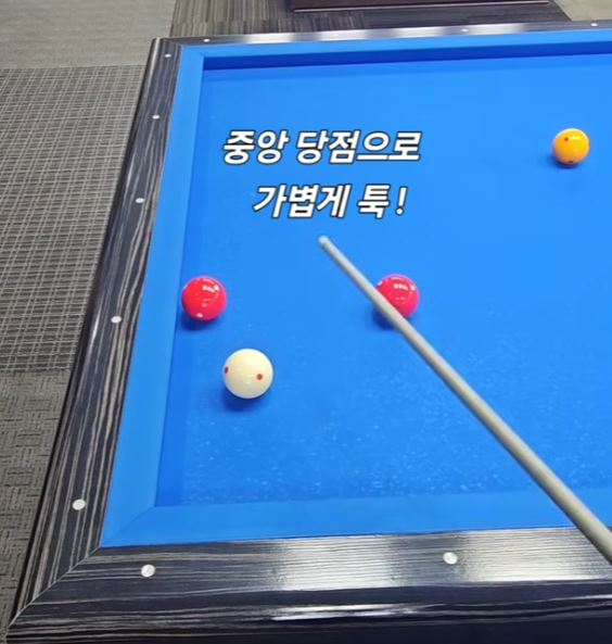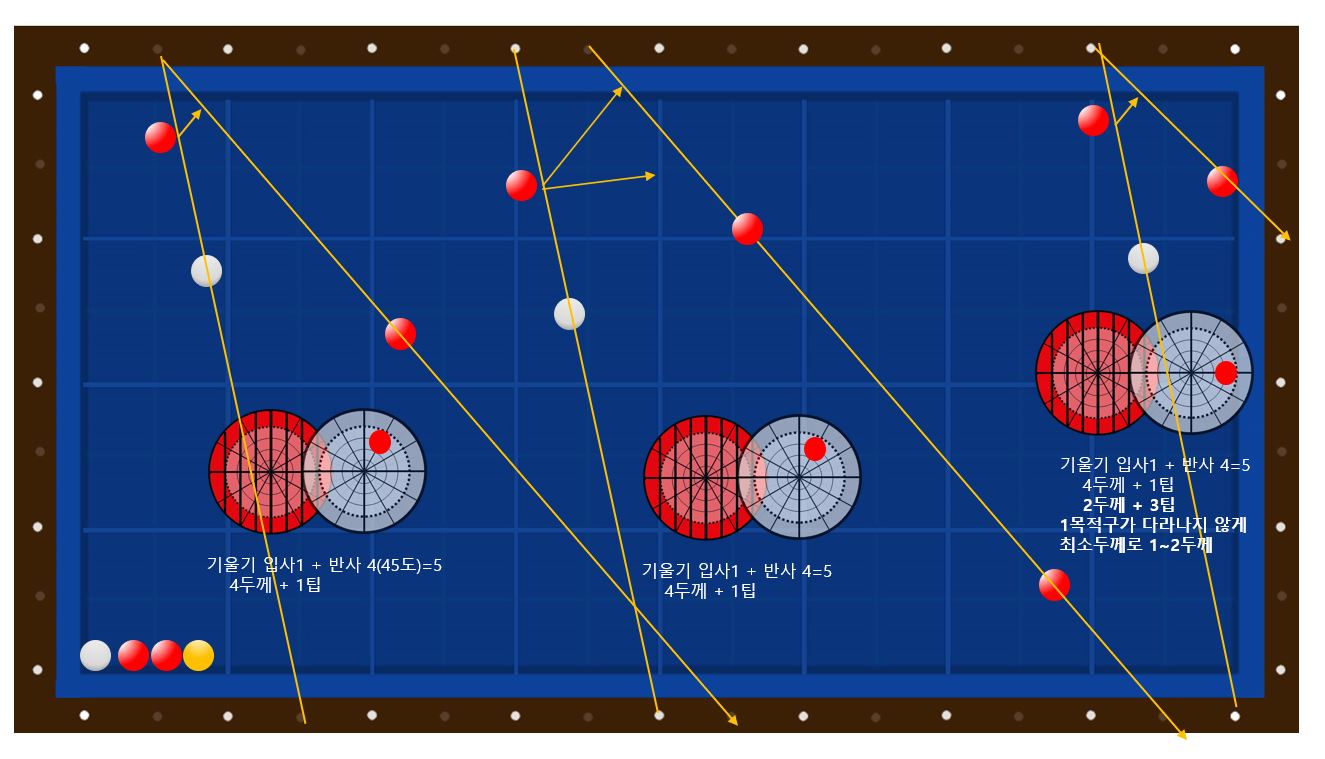 1/2 두께, 중앙당점, 가볍게 툭 short( 세운다, 1공거리), 좌로 90도 진행반사