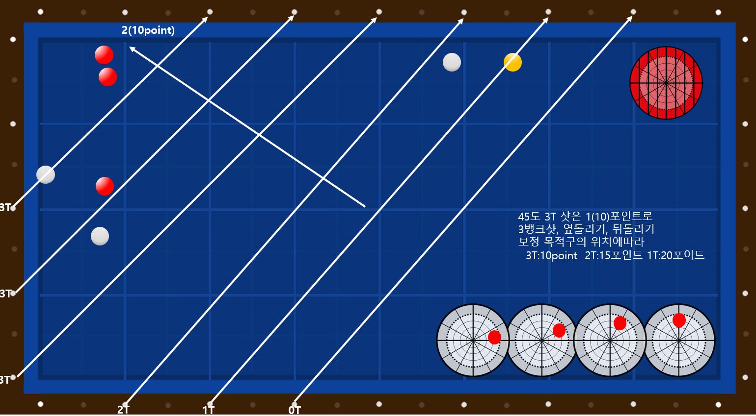 - 큐선 단장 45도 라인의 샷은 장축 1(10포인트)로 돌아온다.
